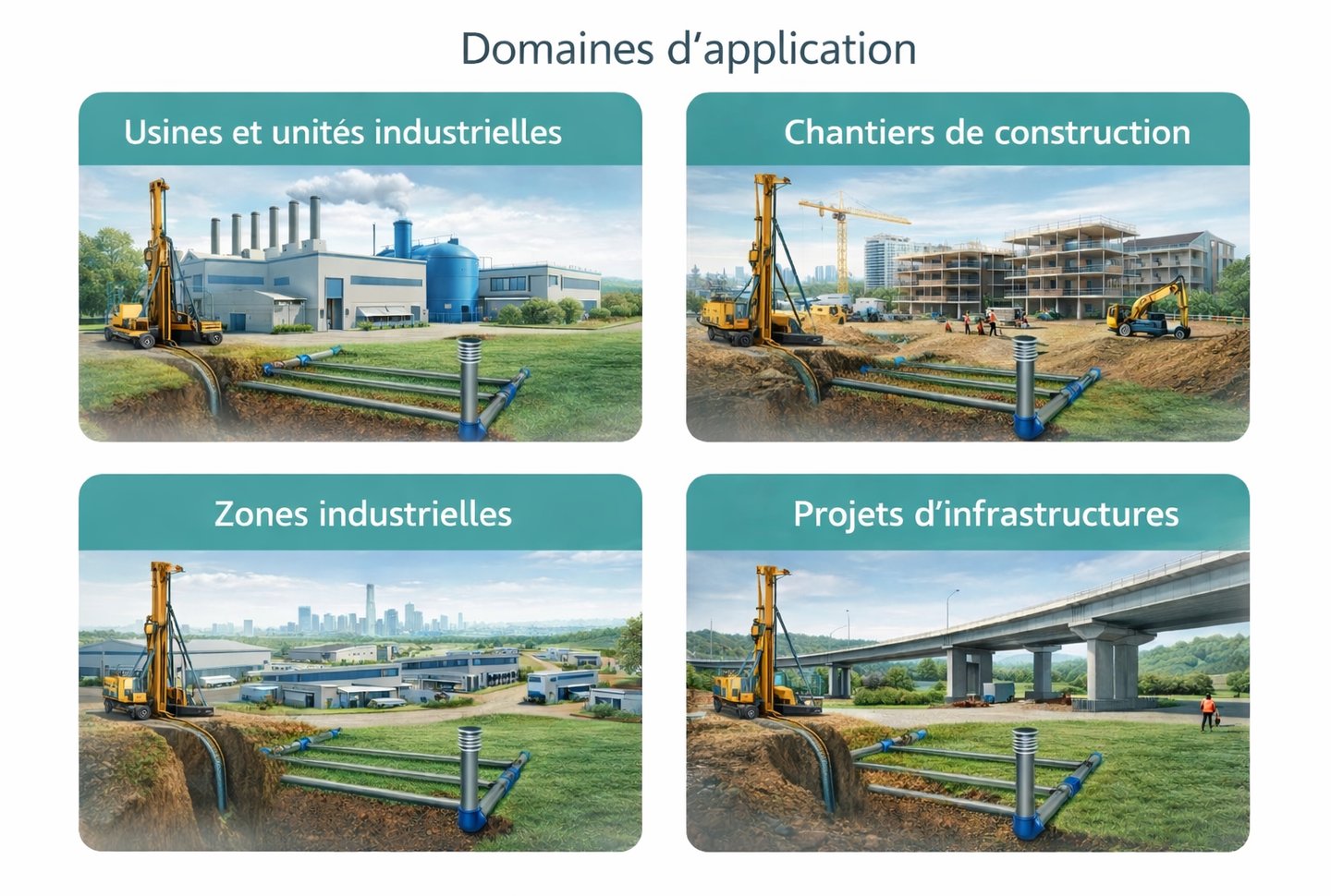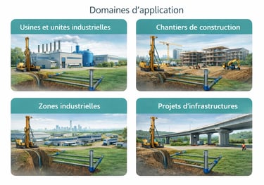 Le forage industriel permet aux entreprises de disposer d’une source d’eau autonome, réduisant la dépendance aux réseaux publics. Il est particulièrement adapté aux projets nécessitant des volumes d’eau importants et un débit stable, tout en garantissant la continuité de la production.